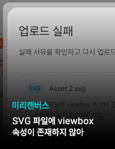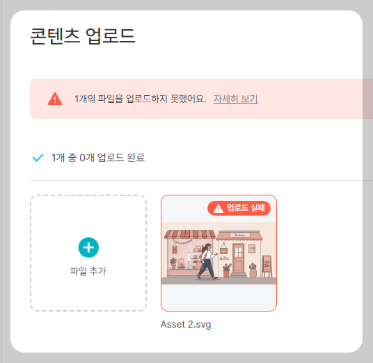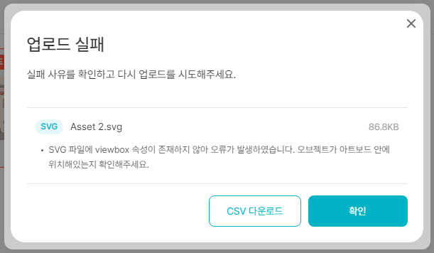 일러스트 요소 작업을 다 하고 SVG로 추출후 업로드 했는데 업로드 실패가 떴어요.