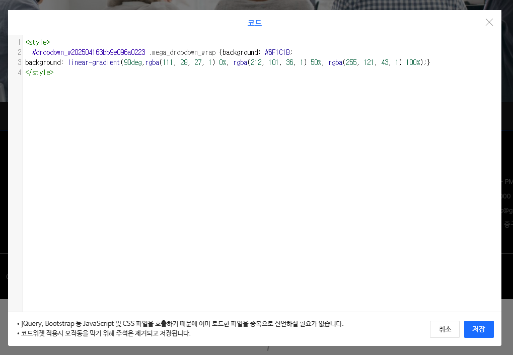 순서2. 아임웹에 코드 위젯을 생성하고 style 태그에 css를 넣는다.